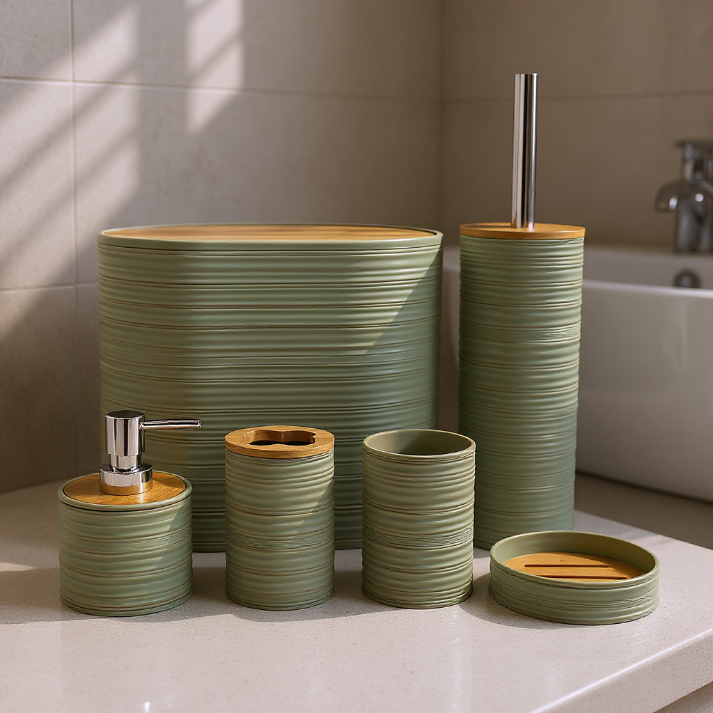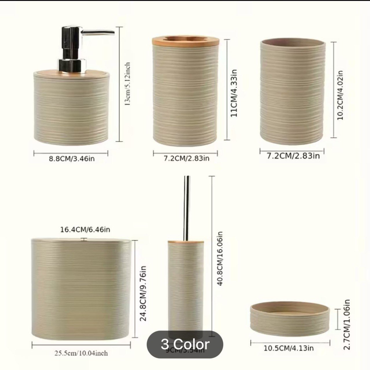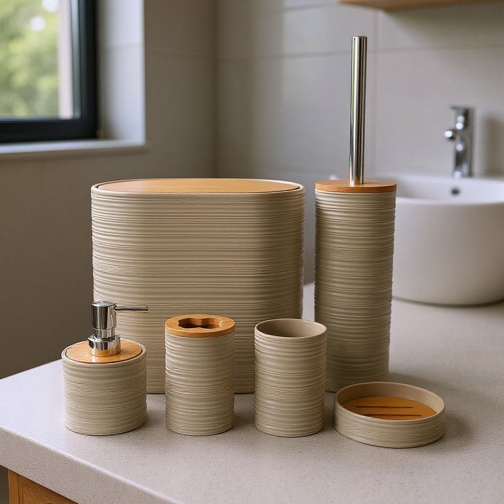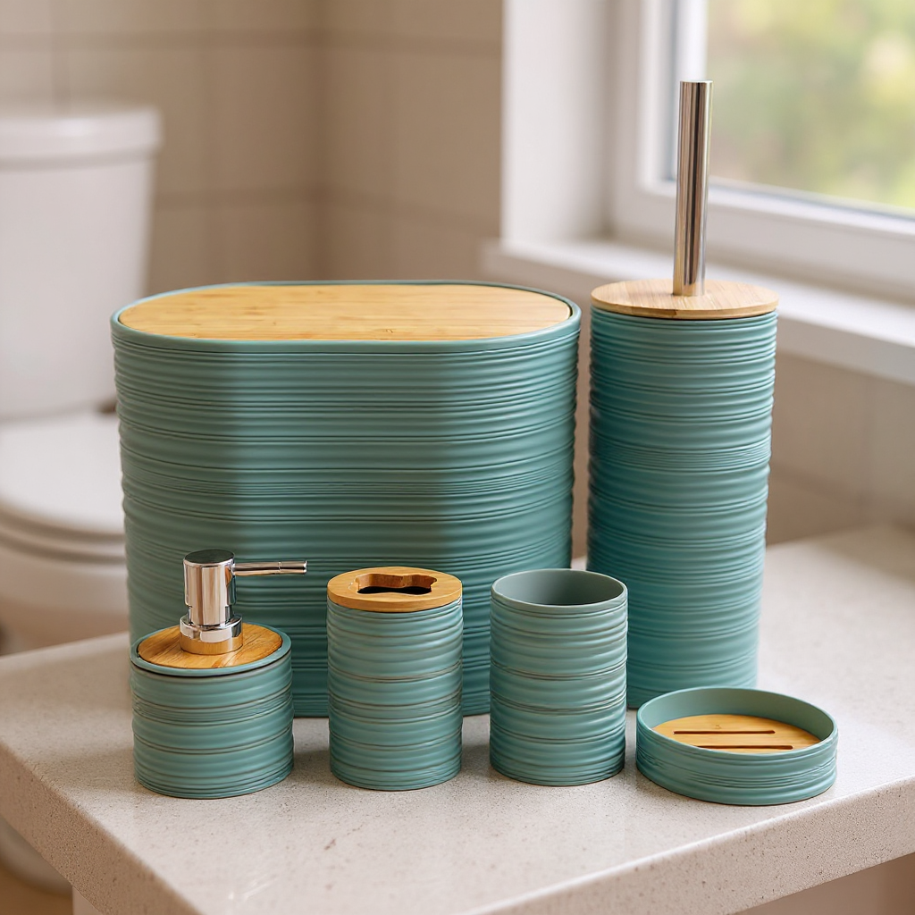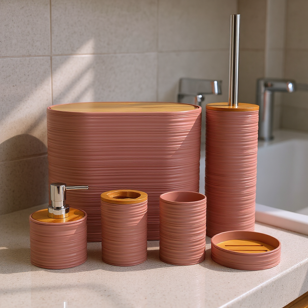 طقم متكامل للحمّام بتصميم عصري أنيق وتفاصيل الخشب الفاخرة ليمنح حمّامك لمسة راقية ومنظمة. مصنوع من البلاستيك عالي الجودة سهل التنظيف وخفيف الوزن، مما يجعله عملياً للاستخدام اليومي ويضفي لمسة من الأناقة والانسجام على ديكور الحمّام.