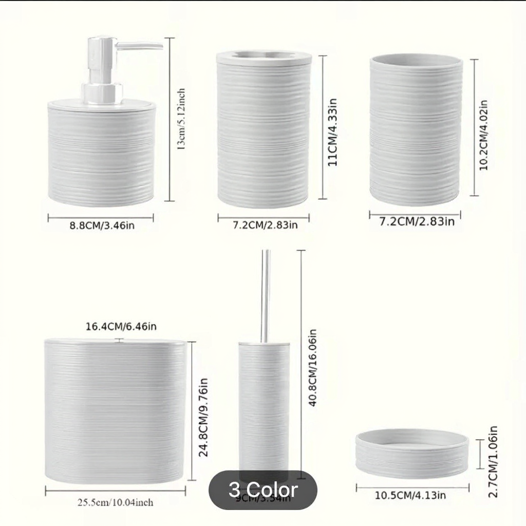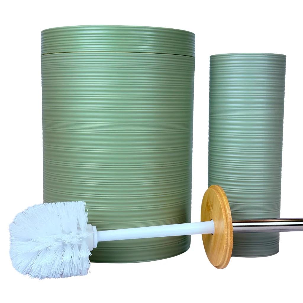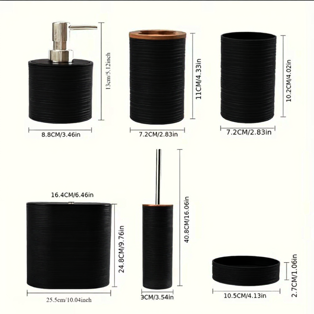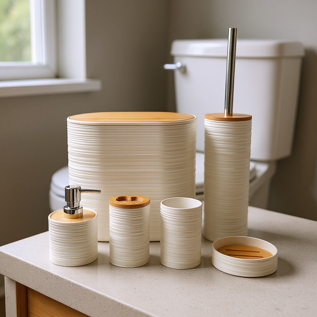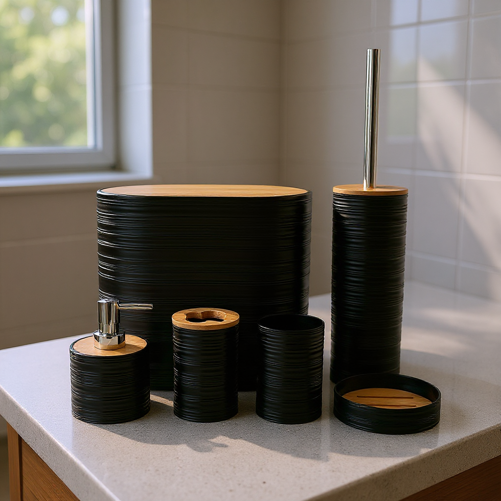 طقم متكامل للحمّام بتصميم عصري أنيق وتفاصيل الخشب الفاخرة ليمنح حمّامك لمسة راقية ومنظمة. مصنوع من البلاستيك عالي الجودة سهل التنظيف وخفيف الوزن، مما يجعله عملياً للاستخدام اليومي ويضفي لمسة من الأناقة والانسجام على ديكور الحمّام.